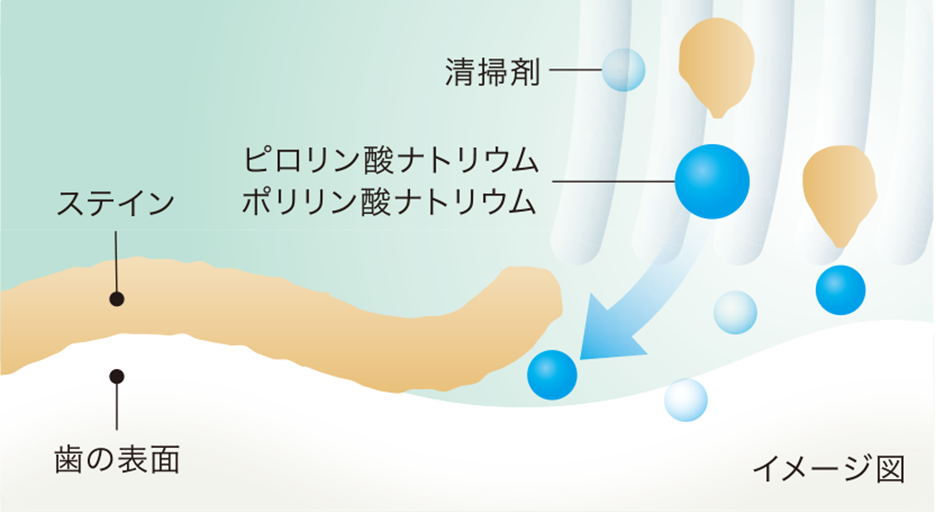 コーヒーや紅茶を摂取することでタンニンやポリフェノールなどの色素がエナメル質表面に蓄積したものがステイン。ステイン(-)とエナメル質表面のカルシウムイオン(+)はイオン結合でしっかり結びついているため、ハブラシだけでは落としにくくなります。