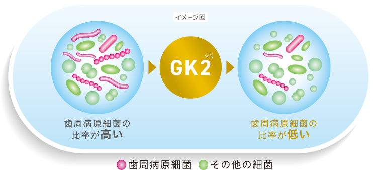 薬用成分GK2が口腔内細菌叢(口内フローラ)を歯周病原細菌が少ない状態に整えて歯肉の炎症を抑え、歯肉炎・歯周炎を予防する。