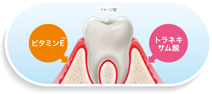 薬用成分ビタミンEが歯肉組織を修復し、抗炎症成分トラネキサム酸が歯肉の炎症・出血を抑え、歯肉炎・歯周炎を予防する。