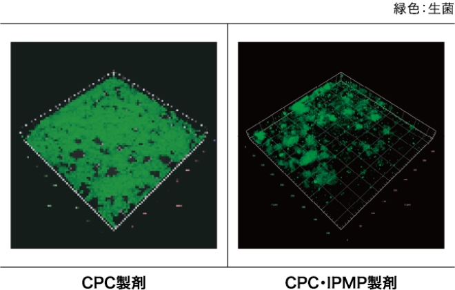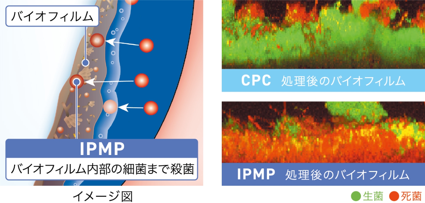 殺菌成分CPC(塩化セチルピリジニウム)が浮遊性細菌を殺菌し、殺菌成分IPMP(イソプロピルメチルフェノール)がバイオフィルム内部に浸透して殺菌します。