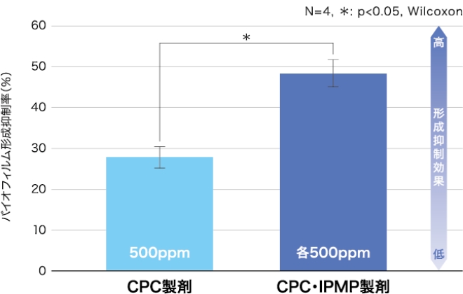 特性が異なる2種の殺菌成分(CPC、IPMP)を含有する独⾃処⽅によりバイオフィルムの形成を抑えます。