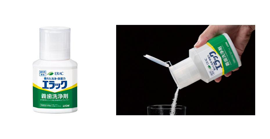高い洗浄力と除菌消臭性能を持ち、義歯の変色や変質の心配が極めて少ない組成です。片手でも使える便利な計量キャップ付きです。